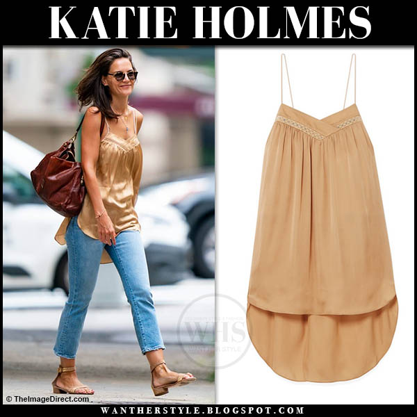 Katie Holmes in beige silk camisole and jeans in NYC on August 17