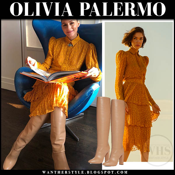 Olivia Palermo in orange blouse, orange pleated skirt and beige knee boots on September 13